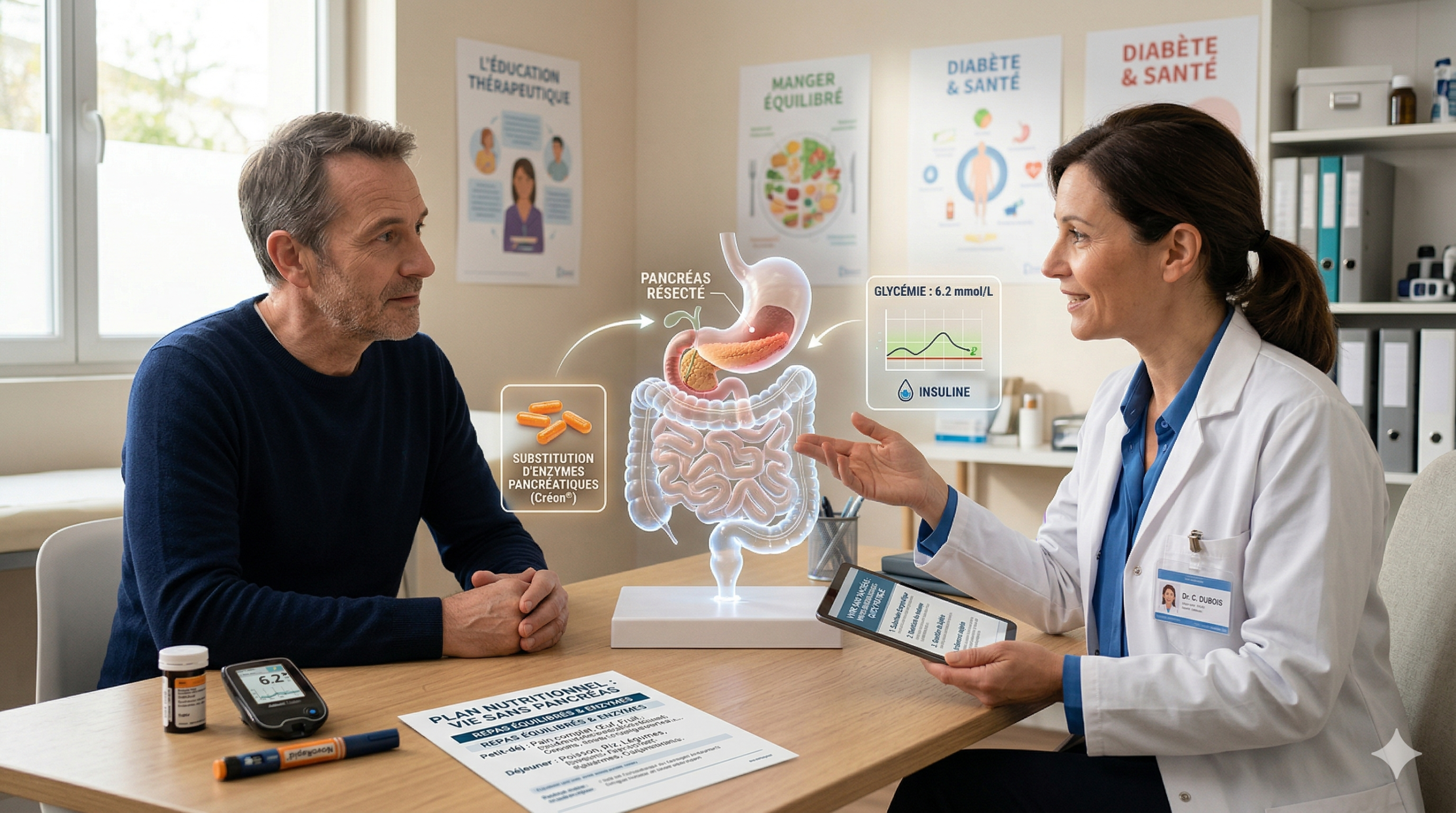Sur le plan métabolique, un diabète de type 3c s’installe systématiquement après une pancréatectomie totale. Ce diabète est particulièrement instable, car le glucagon protecteur n’est plus produit. Le risque d’hypoglycémie sévère est donc plus élevé que dans un diabète classique.