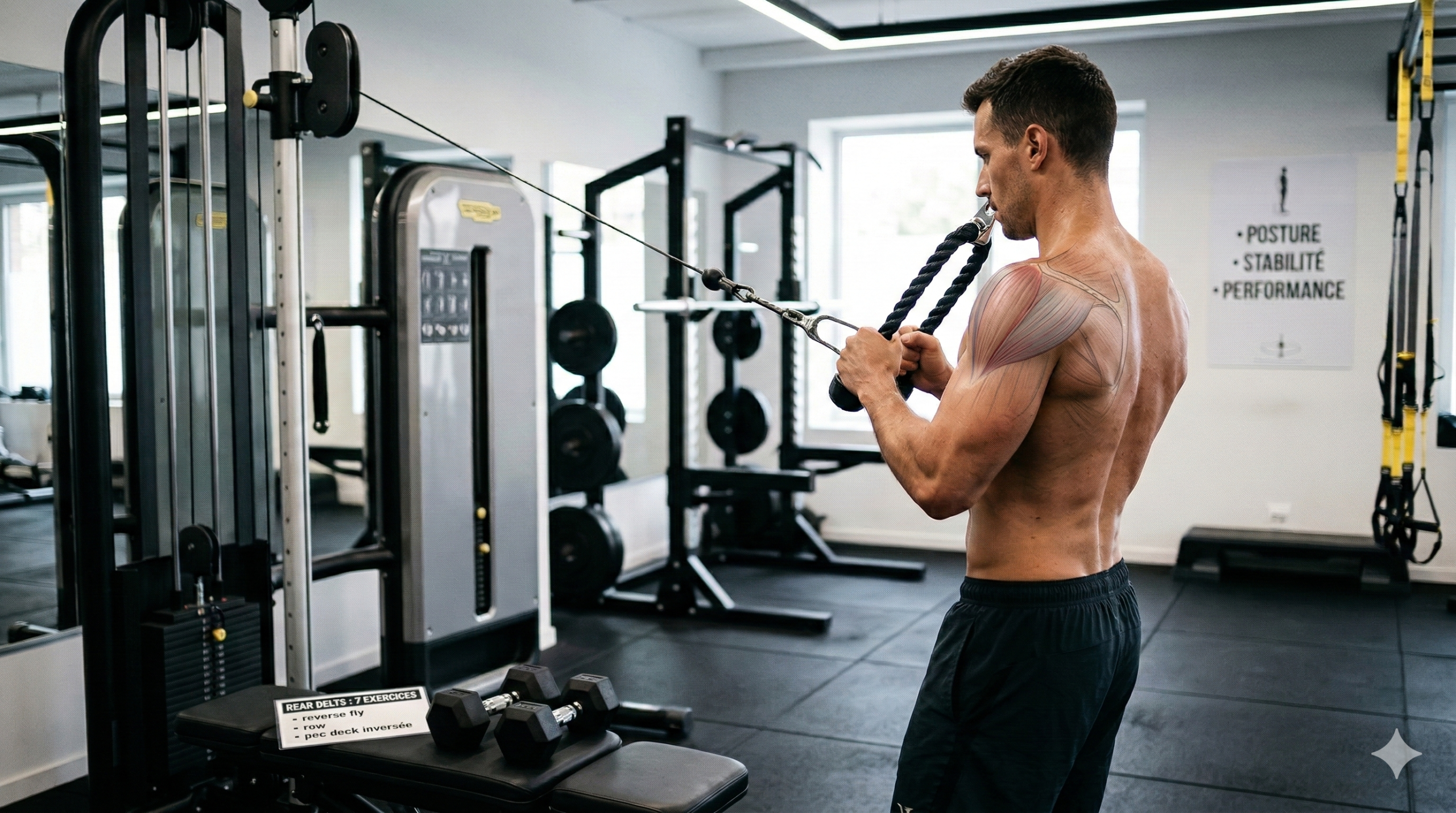 - Performance : un rear delt fort améliore la stabilité au développé couché, le contrôle aux tractions et la puissance au rowing.